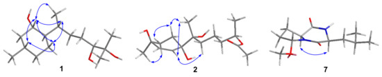 Key NOE correlations (arrows) of 1, 2, and 7.