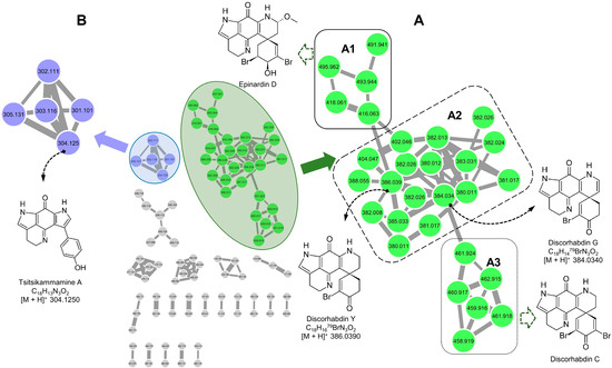 The subfamily A1 (Figure 1) contained five nodes and it was identified as an epinardin subcluster, separated from the subfamily A2 by bearing two bromine atoms and a methoxy function. Two nodes with m/z [M + H]+ 416.0630 (C19H1979BrN3O3) and m/z [M + H]+ 491.9410 (C19H1679Br2N3O3) from this subfamily had resulted in no hits in MarinLit, but based on similarity of their MS2 fragmentation pattern on CFM-ID platform, these two nodes were identified as new derivatives of epinardin D m/z 494.9793 (C19H1979Br2N3O3) [39]. The node at m/z 416.0630 [M + H]+ was connected to two nodes in subfamily A2, indicating its structural similarity to the discorhabdin subcluster. The other three nodes in A1 were annotated as bromine isotope ions of these two compounds.