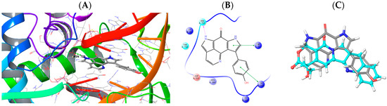 Both tsitsikammamines and discorhabdins have been reported to show potent anticancer activities in vitro [28,30,40]. On a molecular level, DNA intercalation, topoisomerase I and II, indoleamine 2,3-dioxygenase (IDO1) and tryptophan 2,3-dioxygenase (TDO) enzymes have been identified as potential targets for tsitsikammamines or their synthetic derivatives, while the inhibition of HIF-1α/p300 interaction has been reported as potential target of discorhabdins [28,34,35,36]. Because both compounds 1 and 2 were isolated in very little amounts, we were unable to test them against any cancer cell lines or pursue any mechanistic studies with any of these enzymes. Hence, in order to assess the potential anticancer activity of our compounds, we opted for a virtual approach by molecular modeling (using Schrödinger software Maestro; www.schrodinger.com). Where possible, based on suitable pdb structures, we performed docking experiments of compounds tsitsikammamine A (1) and 16,17-dehydrotsitsikammamine A (2) within the binding sites of their reported possible targets (topoisomerase I/II, indoleamine 2,3-dioxygenase IDO1). Thus, we prepared available relevant pdb protein structures, removed the original ligands and generated receptor grids. Small molecule three-dimensional (3D) structures of 1 and 2 were energetically minimized and possible tautomers/protonated states were evaluated (LigPrep) to yield one compound structure each. Using these optimized ligand structures, docking into the prepared respective active site was performed by Glide XP [41]. Calculated 3D binding modes were illustrated, or presented as 2D ligand-interaction diagrams, for clarity.
