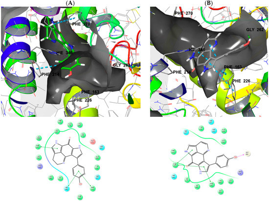 Inspecting the docking poses of tsitsikammamine A (1) and its derivative 16,17-dehydrotsitsikammamine A (2) in the above mentioned protein structures on a molecular level suggests slight evidence for the role of unsaturation. Compound 2 shows a totally planar aromatic core, which is somewhat conformationally twisted out of plane in the case of 1 having two sp3 carbon atoms in the ethyl bridge. Thus, the total planar core of 2 preventing the ligand to access deeper into the IDO1 binding pocket, addressing aromatic interactions towards front residues Phe163/Phe226, and additionally forming an H-bond towards GLY262 within the solvent opening area. In contrast, 1 is actually filling the deep lipophilic pocket of IDO1, thereby not able to address an H-bond to solvent accessible residues. Interestingly, when compared to 2, compound 1 is showing an about 180° twisted core dominated by aromatic interactions to side chain residues Phe214/Phe270/Hie346. However, structure-activity relationship studies (SARs) clearly pointed out the diminished cytotoxicity in discorhabdins with ∆16 unsaturation [45,46]. The debated double bond of 2 is not part of an electrophilic reactive α,β-unsaturated Michael acceptor system (“warhead”), which could covalently attach to the binding site. While our molecular modeling approach suggested possible binding interactions for 1 and 2 towards topoisomerases/DNA intercalation and IDO1, structural data for the further possible targets such as tryptophan 2,3-dioxygenase (TDO) and HIF-1α/p300 protein was not sufficient to draw analogous conclusions.
