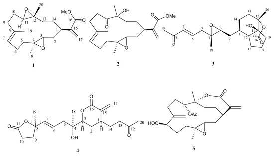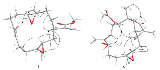 The 13C NMR data (Table 3) and the HRESIMS of 5 showed that it has the same molecular formula as flexibilisolide G [17], that is, C22H32O7. They also have similar functional groups, including an α-exomethylene-ε-lactone ring, an acetoxyl group, and a methyl-substituted epoxy group. However, the obvious difference between the two compounds is that the 6,7-double bond in flexibilisolide G is isomerized to an exocyclic double bond at C-8 in 5. In addition, the hydroperoxy group at C-7 in flexibilisolide G was found to migrate to C-8 in 5. The above findings were further confirmed by COSY and HMBC correlations. The 1R*, 12R* configuration of the α-exomethylene-ε-lactone ring was deduced based on the NOESY correlations from H-1 to H-14α, from H3-20 to H-13β, and from H-14β to H-13β. In addition, NOESY correlations from H-11 to both H-7 and H-1 as well as H-1 to H-4 suggested the relative configurations of C-3, C-4, C-7, and C-11 as shown in Figure 4.