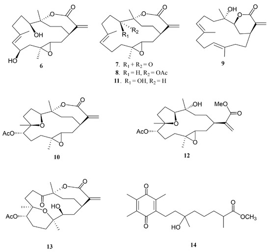 1H and 13C spectra of compounds 1–14 and the hydrolyzed product of 7 are available online at http://www.mdpi.com/1660-3397/16/8/278/s1. Figure S1: 1H NMR spectrum of compound 1 in CDCl3, Figure S2: 13C NMR spectrum of compound 1 in CDCl3, Figure S3: 1H NMR spectrum of compound 2 in CDCl3, Figure S4: 1H NMR spectra of compound 2 and hydrolyzed product of 7 in CDCl3, Figure S5: 13C NMR spectra of compound 2 and hydrolyzed product of 7 in CDCl3, Figure S6: 13C NMR spectrum of compound 2 in CDCl3, Figure S7: 1H NMR spectrum of compound 3 in CDCl3, Figure S8: 1H NMR spectrum of compound 3 in pyridine-d5, Figure S9: 13C NMR spectrum of compound 3 in CDCl3, Figure S10: 1H–1H COSY spectrum of 3 in pyridine-d5, Figure S11: 1H NMR spectrum of compound 4 in C6D6, Figure S12: 13C NMR spectrum of compound 4 in C6D6, Figure S13: 1H NMR spectrum of compound 5 in CDCl3, Figure S14: 13C NMR spectrum of compound 5 in CDCl3, Figure S15: 1H NMR spectrum of compound 6 in CDCl3, Figure S16: 13C NMR spectrum of compound 6 in CDCl3, Figure S17: 1H NMR spectrum of compound 7 in CDCl3, Figure S18: 13C NMR spectrum of compound 7 in CDCl3, Figure S19: 1H NMR spectrum of compound 8 in CDCl3, Figure S20: 13C NMR spectrum of compound 8 in CDCl3, Figure S21: 1H NMR spectrum of compound 9 in CDCl3, Figure S22: 13C NMR spectrum of compound 9 in CDCl3, Figure S23: 1H NMR spectrum of compound 10 in CDCl3, Figure S24: 13C NMR spectrum of compound 10 in CDCl3, Figure S25: 1H NMR spectrum of compound 11 in CDCl3, Figure S26: 13C NMR spectrum of compound 11 in CDCl3, Figure S27: 1H NMR spectrum of compound 12 in CDCl3, Figure S28: 13C NMR spectrum of compound 12 in CDCl3, Figure S29: 1H NMR spectrum of compound 13 in CDCl3, Figure S30: 13C NMR spectrum of compound 13 in CDCl3, Figure S31: 1H NMR spectrum of compound 14 in CDCl3, Figure S32: 13C NMR spectrum of compound 14 in CDCl3.