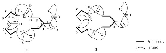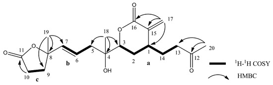 The molecular formula of 4 was found to be C20H28O6 as deduced from the HRESIMS and 13C NMR data, suggesting seven degrees of unsaturation. The 13C NMR data of 4 (Table 3) showed signals attributable to two double bonds (δc 139.5, 126.0, 136.9, 124.1), one ketone carbonyl (δc 205.6), and two ester carbonyls (δc 175.4, 165.3), which accounted for five degrees of unsaturation. Accordingly, the structure of 4 may contain two rings. From the COSY spectrum of 4, it was possible to suggest the presence of three proton sequences for H2-13/H2-14/H-1/H-2/H-3, H2-5/H-6/H-7, and H2-9/H2-10 (a–c, respectively; Figure 6). Key HMBC correlations from H3-20 (δH 1.64) to C-12 (δc 205.6) and C-13 (δc 39.4); from H2-17 (δH 6.40, 5.12) to C-15 (δc 139.5), C-16 (δc 165.3), and C-1 (δc 35.9); from H3-18 (δH 1.00) to C-3 (δc 83.0), C-4 (δc 72.5), and C-5 (δc 41.3); and from H3-19 (δH 1.04) to C-7 (δc 136.9), C-8 (δc 83.9), and C-9 (δc 33.9); as well as H2-10 (δH 2.05, 1.94) to C-11 (δc 175.4) were observed, allowing to establish the planar structure of 4 as shown in Figure 6.