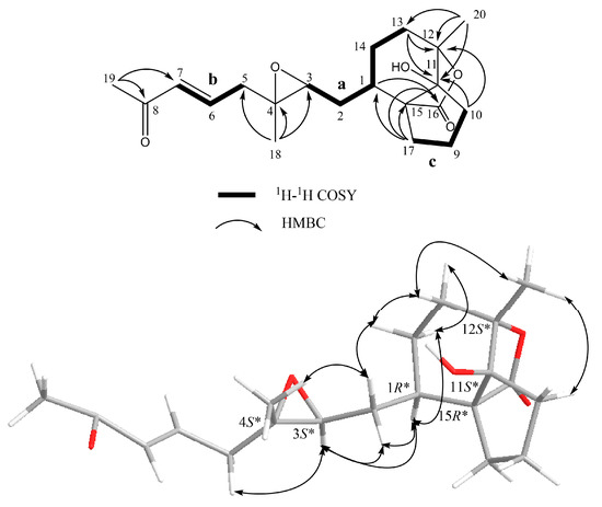 Flexbilisin D (1) was obtained as a colorless oil and its high-resolution electrospray ionization mass spectrometry (HRESIMS) (m/z 371.2196 [M + Na]+) data established the molecular formula of C21H32O4, indicating six degrees of unsaturation. The IR spectrum showed the absorption bands of carbonyl group (1716 cm−1) and double bond (1647 cm−1). The NMR data (Table 1), including 13C NMR and distortion less enhancement by polarization transfer (DEPT) spectra, displayed 21 carbin signals which can be classified as three methyls (δc 15.3, 17.0, 17.8), one methoxy (δc 52.0), seven sp3 methylene (δc 22.2, 24.6, 27.4, 31.5, 33.0, 36.0, 36.9), one sp2 methylene (δc 124.4), three sp3 methine (δc 35.2, 60.1, 61.9), one sp2 methine (δc 126.5), two sp3 quaternary (δc 60.2, 60.8), and three sp2 quaternary (134.2, 142.7, 167.3) carbons. The 13C NMR signals at δc 142.7 (C), δc 124.4 (CH2) and the 1H NMR signals at δH 6.26 (1H, s) and δH 5.48 (1H, s) revealed the presence of a 1,1-disubstituted double bond, while those at δc 134.2 (CH), δc 126.5 (C), and δH 5.18 (1H, t, J = 5.6 Hz) are indicative of a trisubstituted double bond. Two trisubstituted epoxides were identified from the NMR signals at δc 61.9 CH, 60.8 C and 60.2 C, 60.1 CH; δH 2.65 dd, J = 10.0 and 3.2 Hz; 2.81 dd, J = 10.0 and 4.0 Hz. The molecular skeleton of 1 was established by the above results, as well as the correlations spectroscopy (COSY) and heteronuclear multiple bond correlation (HMBC) correlations as shown in Figure 3. By analysis of the COSY correlations, it was possible to identify three partial structures (a–c). The fact that the methyl ester group [CO (δc 167.3)/OMe (δc 52.0; δH 3.76)] was on C-15 (δc 142.7) was confirmed by the HMBC correlation from H2-17 (δH 6.26, 5.48) to C-16 (δc 167.3). The two epoxides were assigned at 3,4- and 11,12-positions with methyl substituents at C-4 (δc 60.2) and C-12 (δc 60.8) according to HMBC correlations from H3-18 (δH 1.29) to C-3 (δc 60.1), C-4, and C-5 (δc 36.9), as well as H3-20 (δH 1.23) to C-11(δc 61.9), C-12, and C-13 (δc 33.0), respectively. Together with other key HMBC correlations from H3-19 (δH 1.65) to C-7 (δc 126.5), C-8 (δc 134.2), and C-9 (δc 36.0), as well as H2-17 to C-1 (δc 35.2), C-15, and C-16 permitted the establishment of the carbon skeleton.