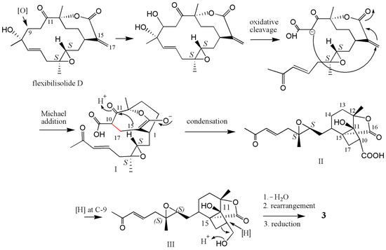 Compound 3 can be hypothesized to derive from a precursor with the cembranoid-type skeleton. As shown in Scheme 1, flexibilisolide D, which was also isolated from this coral [17], was suggested as a precursor. Flexibilisolide D was converted to intermediate I by oxidative cleavage and Michael addition. Reduction of the carboxylic acid of the cyclobutane intermediate (II), derived from I by the aldol condensation, would produce an alcohol functionality in III. Rearrangement of the hydroxymethyl cyclobutane through a reductive ring opening in III resulted in a formation of the cyclopentane ring in 3. This suggested that the configurations of C-1, C-3, C-4, and C-12 should be the same as those of flexibilisolide D and related analogues possessing a 3,4-epoxide group, isolated previously from this soft coral [17]. The relative configurations of C-11 and C-15 were determined by a combination of NOESY correlations (Figure 5) and pyridine-induced solvent shift experiment [31]. The NOESY correlations from H3-20 to H2-10 allowed the assignment of the lactone ring as α-oriented. However, the present NOESY data were unable to fully confirm the orientation of OH-11. As a result, the pyridine-induced solvent shift experiment was applied on 3. H-2β (δH 1.66 in pyridine), which is 1,3-diaxial to OH-11, was found to be downfield shifted by 0.28 ppm with respect to H-2β, measured in CDCl3 (Table 2), suggesting the β-orientation of OH-11. Consequently, the relative configurations 1R*, 3S*, 4S*, 11S*, 12S*, 15R* were suggested for 3.