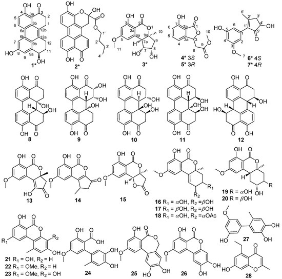 By comparing NMR data with the values in literature, the structures of the twenty-one known compounds were identified as altertoxin I (8) [22], 7-epi-8-hydroxyaltertoxin (9) [6], stemphytriol (10) [23], 6-epi-stemphytriol (11) [6], stemphyperylenol (12) [23,24], (R)-1,6-dihydroxy-8-methoxy-3a-methyl-3,3a-dihydrocyclopenta[c]iso- chromene-2,5-dione (13) [25], 1-deoxyrubralactone (14) [25], 6-hydroxy-8-methoxy-3a-methyl-3a,9b-dihydro-3H-furo[3,2-c]isochromene-2,5-dione (15) [26], altenuene (16) [27], 4′-epialtenuene (17) [28], (−)-(2R,3R,4aR)-altenuene-3-acetoxy ester (18) [29], dihydroaltenuenes A (19) [15], 3-epi-dihydroaltenuene A (20) [30], alternariol (21) [31], alternariol monomethyl ether (22) [32], 3′-hydroxyalternariol-5-O-methyl ether (23) [28], altenusin (24) [33], alterlactone (25) [28], altenuisol (26) [34], 5′-methoxy-6-methyl-biphenyl-3,4,3′-triol (27) [26], and 2,5-dimethyl-7-hydroxychromone (28) [35], respectively.