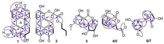 COSY “H—H” and key HMBC “H→C” correlations of compounds 1–7.