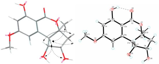 Compound 3 possessed a molecular formula of C14H16O6 on the basis of its NMR data and the HRESIMS ion peak at m/z 303.0844 [M + Na]+, indicating seven indices of hydrogen deficiency. The 1H NMR spectrum (Table 2) exhibited two aromatic protons (δH 6.52, brs, H-6; 6.43, brs, H-4); three methines (δH 4.20, ddd, J = 7.0, 5.5, 2.5 Hz, H-8; 3.90, dd, J = 10.5, 5.0 Hz, H-7; 3.07, d, J = 10.0 Hz, H-7a); one methoxy group (δH 3.88, s, H3-11); and a methyl singlet (δH 1.47, s, H3-10). The 13C NMR and HSQC spectra indicated the presence of 14 carbons, including two methyls (δC 56.2, C-11; 25.7, C-10), one sp3 methylene, three sp3 methines (two oxygenated at δC 80.1, C-7; 71.2, C-8), two sp2 methines (δC 101.0, C-4; 108.9, C-6), four sp2 non-protonated carbon, and an ester carbonyl (δC 170.0, C-2). Because one benzene ring and one carbonyl accounted for five degrees of unsaturation, double ring fragment was required for the structure of 3. Its NMR data were similar to those of dihydroaltenuenes A (19) [15], the obvious differences being the disappearance of a methylene signal (δC 28.1) and the downfield shift of the oxygenated methine in 3, which indicated that a fragment of the six-membered ring in 19 was replaced by a five-membered ring in 3. The deduction was confirmed by following COSY correlations of H-7a/H-7/H-8/H2-9, as well as HMBC correlations, from H-7 and H-7a to C-6a; from H-6, H2-9 and H3-10 to C-7a; and from H-8, H2-9 and H3-10 to C-9a (Figure 2). The NOESY spectrum in DMSO-d6 (Figure 4) exhibited the cross-peaks of H-7a to H-9α, H3-10, OH-7, and OH-8, and also of H-9β to H-7, which suggested that CH3-10, H-7a, OH-7, and OH-8 were on the same side. The Cu Kα radiation for the X-ray diffraction experiment with the refined Flack parameter of −0.02(7) allowed the assignment of the absolute configuration of all the stereogenic centers in 3 as 7R, 7aR, 8S, and 9aS. Thus, the absolute structure of 3 was unambiguously elucidated and named nordihydroaltenuenes A.