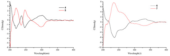 Compounds 6 and 7, obtained as a yellow powder, were also believed to be a single compound at first. The HRESIMS spectrum supported a molecular formula of C13H14O4, requiring 7 degrees of unsaturation. The 1H NMR and 13C NMR data (Table 2) of 6/7 were almost identical to those of 4′-(S)-(3,5-dihydroxyphenyl)-4′-hydroxy-6′-methylcyclopent-1′-en-5′-one isolated from Penicillium sp. HN29-3B1 [21], indicating that 6/7 were a structural analog, except for the presence of a methoxy group (δC/H 55.7, C-7). The deduction was confirmed by the HMBC correlation (Table 2) from H3-7 to C-3. Analyzed by a chiral-phase column (Phenomenex Lux Cellulose-2, 250 × 4.6 mm, 5 μm), compounds 6/7 were found to be stereoisomeric mixture, whose mass ratio was about 1:3.5 (Figure S39). The single compound 6 ([α +3.1, c 0.1, MeOH) and 7 ([α −7.2, c 0.1, MeOH) were isolated, and they had opposite ECD spectra (Figure 5). The optical rotation of 6 was consistent with that of 4′-(S)-(3,5-dihydroxyphenyl)-4′-hydroxy-6′-methylcyclopent-1′-en-5′-one [21], indicating that they had the same S configuration at C-4′, opposite to that of 7. Thus, the absolute structure of 6 was determined as 4′-(S)-(3-Methoxy-5-hydroxyphenyl)-4′-hydroxy-6′-methylcyclopent-1′-en-5′-one and named (S)-alternariphent A1, while the absolute structure of 7 was determined as 4′-(R)-(3-Methoxy-5-hydroxyphenyl)-4′-hydroxy-6′-methylcyclopent-1′-en-5′-one and named (R)-alternariphent A2.