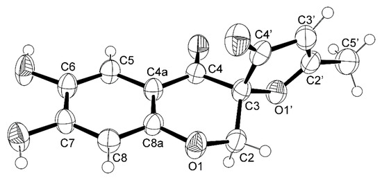 The ORTEP view, shown in Figure 5, not only confirmed the proposed structure for 4 but also determined unequivocally the absolute configuration of C-3 as 3S. Therefore, the absolute structure of 4 is (3S)-6,7-dihydroxy-5′-methyl-3′H,4H-spiro[chromene-3,2′-furan]-3′,4-dione, which was named erubescenschromone A.