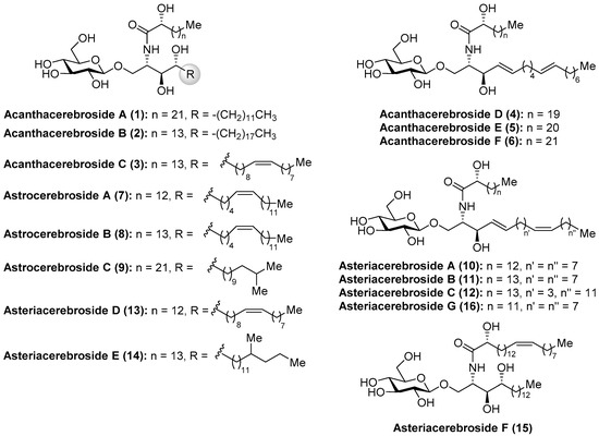 Structures of the acanthacerebrosides (1–6), astrocerebrosides (7–9), and asteriacerebrosides (10–16).