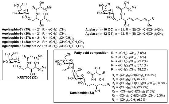Structures of the agelasphins (25–31), KRN7000 (32), and damicoside (33).