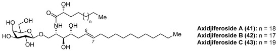 Barnathan et al. [35] described the isolation of axidjiferosides A–C (41–43) (Figure 4) from the marine sponge Axinyssa djiferi, collected from mangrove tree roots in Senegal. Interestingly, the structure of these compounds contained the unusual Δ6-phytosphingosine and also the unusual β-configuration of the galactopyranosyl unit. These compounds showed significant antimalarial activity, with an IC50 of 0.53 ± 0.2 µM against a chloroquine-resistant strain of Plasmodium falciparum. In addition, the axidjiferosides also showed antiplasmodial activity, with low cytotoxicity against various human cancer cell lines, and no significant antitrypanosomal and antileishmanial activities. In contrast to the α-galactosylceramide derivatives, such as the agelasphins, which displayed immunostimulating properties, the antimalarial activity exhibited by the axidjiferosides was ascribed by the authors to the β anomeric configuration present in these natural products.
