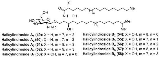 Within the family of cerebrosides of marine origin, the halicylindrosides (49–58) (Figure 6) were isolated and characterized by Fusetani´s group in 1995 from the marine sponge Halichondria cylindrata [37]. These structural studies revealed that the halicylindrosides were a new family of phytosphingosine-containing cerebrosides, which promoted a great deal of expectation by virtue of their antifungal activity against Mortierella remanniana at 250 µg/disk and citotoxity against P388 murine leukemia cells at 6.8 µg/mL, respectively.