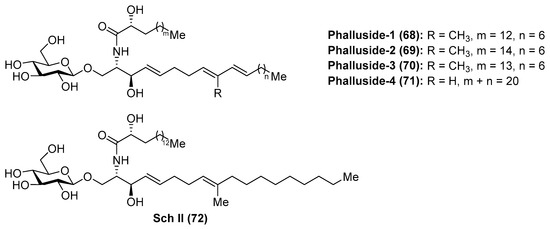 Phallusides (68–71) (Figure 7) were isolated from the Mediterranean ascidian Phallusia fumigata and from the starfishes Allostichaster inaequalis and Cosmasterias lurida [39] and their structures were elucidated by a combination of spectroscopic and chemical degradation studies. These studies revealed the presence of an unusual sphingoid base, which corresponded to the 2-amino-9-methyl-d-erythro-(4E,8E,10E)-octadeca-4,8,10-triene-1,3-diol. Prior to these findings, Karlsson et al. [40] had described isolation and structure elucidation of a closely related glycosphingolipid from the sea anemone Metridium senite, which was assigned as Sch II (72). Interestingly, this compound was also isolated from the basidiomycete Schizophyllum commune some years later [41].