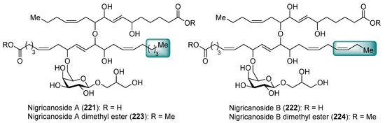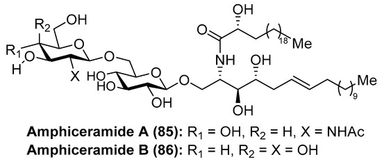 Amphiceramides A (85) and B (86) were isolated from the Caribbean sponge Amphimedon compressa by Mangoni et al. [44] (Figure 8). The structures of both glycolipids contain an unusual Δ6-phytosphingosine unit, which can be found in other secondary metabolites such as the aforementioned axidjiferosides A–C (41–43). In addition, amphiceramide A (85) contains an uncommon N-acetyl-β-glucosamine, which has never been found in any natural product. Amphiceramide B (86) was the first glycosphingolipid that possesses an allolactose [Gal(1 β→6)Glc] residue β-linked to the ceramide moiety.