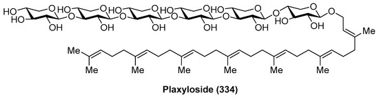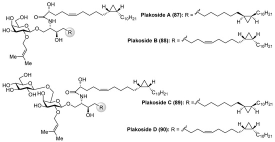 Fattorusso et al. [45] described the isolation of plakosides (87–90) (Figure 9) from the marine sponge Plakortis simplex, which featured the presence of a cyclopropane ring in the lipidic chain and a 2-O-prenylation of the carbohydrate moiety. Interestingly, in contrast to the immunostimulating property of related glycosphingolipids, such as agelasphins, the plakosides exhibited potent immunosuppressive activity, with plakosides A (87) and B (88) as inhibitors of the proliferative response of lymph-node cells when T cells were stimulated with concavaline A in all doses tested (0.01–10 µg/mL). In addition, these natural products did not display cytotoxic property. This intriguing immunosuppressive activity was ascribed to the presence of the susbstituent on C-2 of the inner monosaccharide. Some years later, the same authors isolated two new related glycosphingolipids, plakosides C (89) and D (90), from another marine-sponge species, Ectyoplasia ferox [46]. Further investigations led to the conclusion that the plakosides are in fact biosynthesized by sponge-associated bacterial symbionts and not from the sponge itself [46].