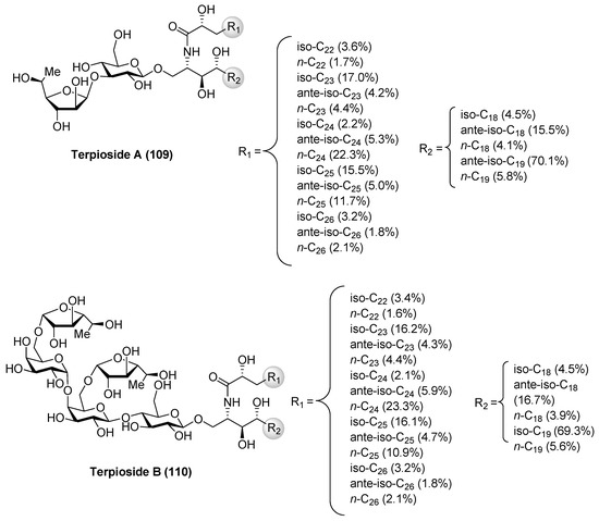 Terpioside A (109) and B (110) (Figure 10) were isolated from the marine sponge Terpios sp. by Costantino et al. [52] and represent the first glycosphingolipids reported from sponges of the genus Terpios. Later, Cutignano et al. [53] reported the isolation of the terpiosides from the Antarctic sponge Lyssodendoryx flabellata. The structure of terpioside A (109) was secured by a combination of extensive spectroscopic analysis, as well as chemical degradation studies, revealing the presence of a unique sugar moiety, comprised of an α-fucofuranoside, linked to the 3-position of a β-glucopyranoside, which is the sugar residue linked to the ceramide. Thus, terpioside A (109) represents the first natural glycosphingolipid that contains an l-fucose in a furanose form. On the other hand, terpioside B (110) contains a pentasaccharide chain, which possesses two terminal α-l-fucofuranose units. The biological activity evaluation of terpioside B (110) led to the discovery that this compound was capable of inhibiting LPS-induced NO release, displaying higher activity than simpler glycosphingolipids, such as terpioside A (109) and monoglucosylceramide [54].