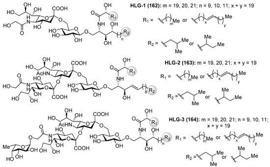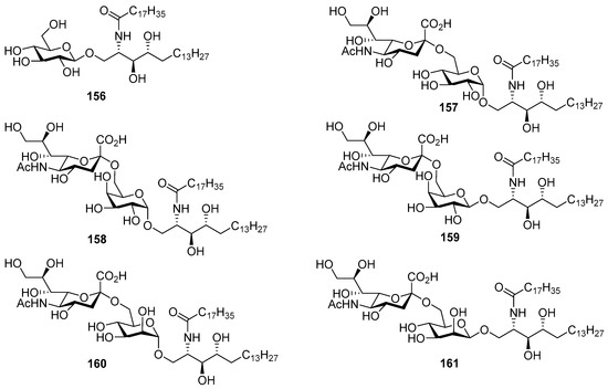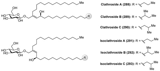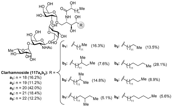 The clarhamnosides 117axby (Figure 11) were isolated as an inseparable mixture of different members from the marine sponge Agelas clathrodes by Costantino et al. [57]. The combination of 2D NMR and CD spectroscopic techniques allowed the structural determination of this complex glycosphingolipid mixture. Clarhamnosides are the first α-galactoglycosphingolipids with a l-rhamnose unit in the sugar head. In addition, the sequential two 1,2-cis-α-d-galactopyranosidic linkages are also rare in nature.