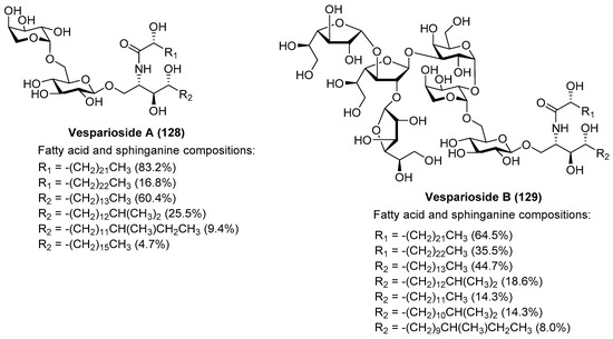 Structures of vespariosides A (128) and B (129).