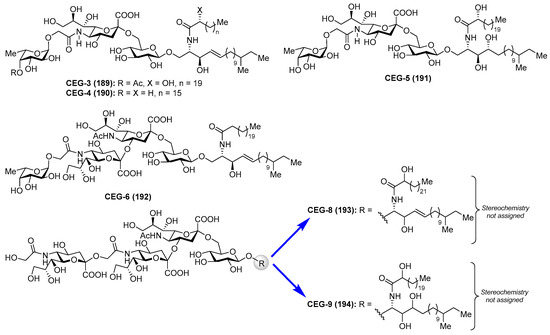 Cerebrosides CE (44–48) (Figure 5) were isolated, together with ganglioside CG-1 (See Section Ganglioside CG-1), from the sea cucumber Cucumaria echinata [36]. These cerebrosides showed toxicity in a brine shrimp lethality assay with the rates of 11–27%. However, no further chemical and biological studies about these cerebrosides have been carried out so far.