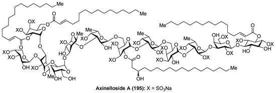 - Warabi, K.; Hamada, T.; Nakao, Y.; Matsunaga, S.; Hirota, H.; van Soest, R.W.M.; Fusetani, N. Axinelloside A, an Unprecedented Highly Sulfated Lipopolysaccharide Inhibiting Telomerase, from the Marine Sponge, Axinella infundibula. J. Am. Chem. Soc. 2005, 127, 13262–13270. [Google Scholar] [CrossRef] [PubMed]