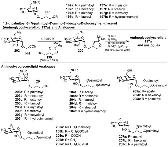 - Sun, Y.; Zhang, J.; Li, C.; Guan, H.; Yu, G. Synthesis of Glycoglycerolipid of 1,2-dipalmitoyl-3-(N-palmitoyl-6′-amino-6′-deoxy-α-d-glucosyl)-sn-glycerol and its Analogues, Inhibitors of Human Myt1-Kinase. Carbohydr. Res. 2012, 355, 6–12. [Google Scholar] [CrossRef] [PubMed]