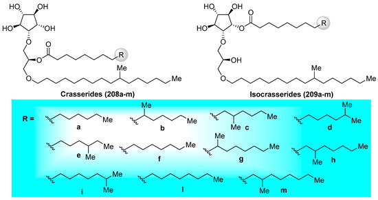- Costantino, V.; Fattorusso, E.; Mangoni, A. Isolation of Five-Membered Cyclitol Glycolipids, Crasserides: Unique Glycerides from the Sponge Pseudoceratina crassa. J. Org. Chem. 1993, 58, 186–191. [Google Scholar] [CrossRef]