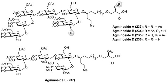 - Wojnar, J.M.; Northcote, P.T. The Agminosides: Naturally Acetylated Glycolipids from the New Zealand Marine Sponge Raspailia agminata. J. Nat. Prod. 2011, 74, 69–73. [Google Scholar] [CrossRef] [PubMed]