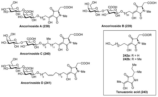 - Ohta, S.; Ohta, E.; Ikegami, S. Ancorinoside A: A Novel Tetramic Acid Glycoside from the Marine Sponge, Ancorina sp. which Specifically Inhibits Blastulation of Starfish Embryos. J. Org. Chem. 1997, 62, 6452–6453. [Google Scholar] [CrossRef]