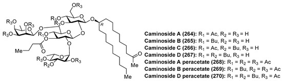 - Linington, R.G.; Robertson, M.; Gauthier, A.; Finlay, B.B.; van Soest, R.; Andersen, R.J. Caminoside A, an Antimicrobial Glycolipid Isolated from the Marine Sponge Caminus sphaeroconia. Org. Lett. 2002, 4, 4089–4092. [Google Scholar] [CrossRef] [PubMed]