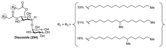 - Barbieri, L.; Costantino, V.; Fattorusso, E.; Mangoni, A. Glycolipids from Sponges. Part 16. Discoside, a Rare myo-Inositol-Containing Glycolipid from the Caribbean Sponge Discodermia dissoluta. J. Nat. Prod. 2005, 68, 1527–1530. [Google Scholar] [CrossRef] [PubMed]