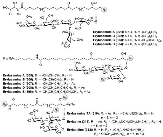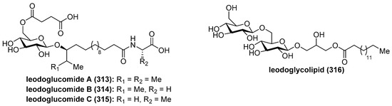 - Tareq, F.S.; Lee, H.-S.; Lee, Y.-J.; Lee, J.S.; Shin, H.J. Ieodoglucomide C and Ieodoglycolipid, New Glycolipids from a Marine-Derived Bacterium Bacillus licheniformis 09IDYM23. Lipids 2015, 50, 513–519. [Google Scholar] [CrossRef] [PubMed]