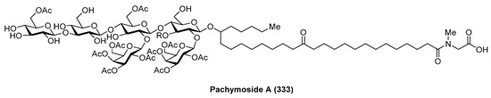 Ganglioside Hp-s1 (144) was isolated from the ovary of the sea urchin Diadema setosum or from the sperm of the sea urchin Hemicentrotus pulcherrimus [62]. This compound showed an interesting neuritogenic activity towards the rat pheochromocytoma PC-12 cell line in the presence of nerve growth factor (NGF) and, when compared to ganglioside GM-1 (25.4%), its effect was better (34.0%). Together with ganglioside Hp-s1, ganglioside DSG-A (145) (Figure 13), isolated also from D. setosum, displayed similar neuritogenic activity, which can be useful for the treatment of neurodegenerative diseases [63].