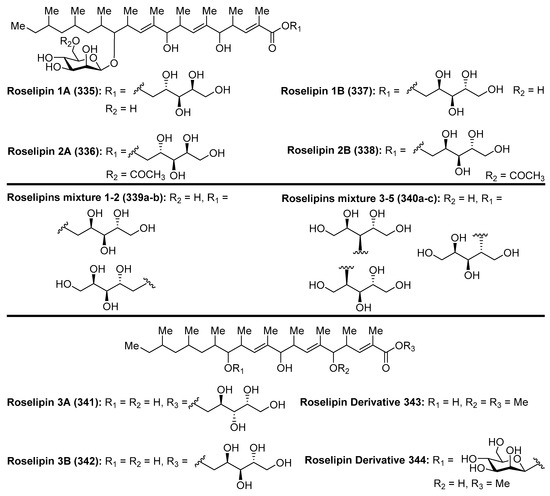 - Ōmura, S.; Tomoda, H.; Tabata, N.; Ohyama, Y.; Abe, T.; Namikoshi, M. Roselipins, Novel Fungal Metabolites Having a Highly Methylated Fatty Acid Modified with a Mannose and an Arabinitol. J. Antibiot. 1999, 52, 586–589. [Google Scholar] [CrossRef] [PubMed]