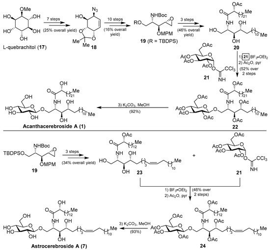 More recently, from the same starfish (A. amurensis), Kim et al. identified new members of related asteriacerebrosides, whose structures were established by mass spectrometric techniques [25]. After the synthesis of acanthacerebroside A (1) by Komori in 1998, the Chida group [26] reported a new synthesis for acanthacerebroside A (1) and astrocerebroside A (7), in which the preparation of the phytosphingosine moiety was achieved using the commercially available L-quebrachitol (17) (Scheme 1). Accordingly, L-quebrachitol (17) was transformed into the azide 18 in seven steps, which was directed towards the phytosphingosine fragment 20, contained in acanthacerebroside A (1). The coupling of 20 with the donor trichloroacetimidate 21 via a glycosylation reaction mediated by BF3.OEt2 provided the corresponding acanthacerebroside A derivative, which was derivatized to the peracetylated 22 to facilitate purification. After removing the acetate protecting groups, natural acanthacerebroside A (1) was obtained. In a similar manner, astrocerebroside A (7) was efficiently prepared from the phytosphingosine 23, synthesized from the common epoxide 19, and the same glycosyl donor (21). From a biological standpoint, surprisingly only the asteriacerebrosides were evaluated, showing that asteriacerebrosides A (10), B (11), and G (16) displayed growth-promoting activity against the plant Brassica campestris. This was the first report of a promotive plant-growth activity of this class of compounds.
