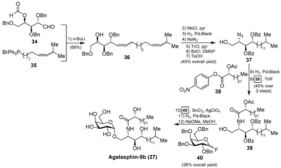 In order to confirm the structures of the agelasphins, Natori, together with Akimoto et al. [34], achieved the first total synthesis of an agelasphin member, agelasphin-9b (27). Accordingly, the construction of the phytosphingosine fragment commenced with the Wittig reaction of aldehyde 34 with phosphonium salt 35 to give a mixture of isomeric alcohols 36 in 68% yield. The alcohol 36 was then converted into the azide 37 in six steps in 45% overall yield. Subsequent reduction of the azide and acetylation of the corresponding amine with p-nitrophenyl ester 38 afforded a protected ceramide 39 in 40% overall yield. Reaction of 39 with galactosyl fluoride 40, under Mukaiyama’s glycosylation conditions, gave the corresponding α-galactoside in 36% yield, which was finally transformed into agelasphin-9b (27) after a deprotection of the protecting groups (Scheme 2). This synthesis was important not only because the authors were able to confirm the structures of these natural products, but also because the strategy for the future construction of these molecules was established and extended to the synthesis of other agelasphins and their analogues, such as KRN7000 (32) [18,19].