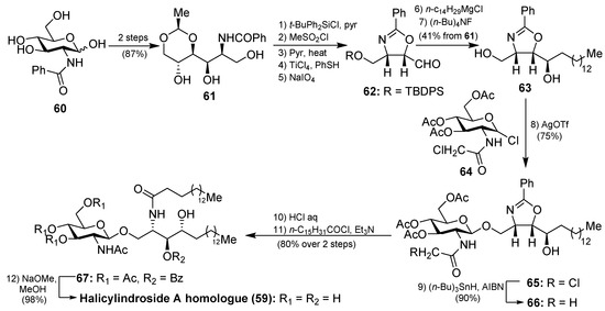 The synthesis of the halicylindroside A homologue 59 was carried out by Murakami et al. [38], paving the way for the synthesis of the natural congeners. Thus, 61, which was prepared from N-benzoyl-d-glucosamine 60 in 87% over two steps, was transformed into the oxazoline derivative 63 in seven steps in 41% overall yield, involving regioselective O-methanesulfonation and diastereoselective Grignard addition as key steps. The coupling between 63 and N-chloroacetyl glucosyl chloride 64, which was chosen as a more efficient donor for the glycosylation reaction, was achieved by using silver trifluoromethanesulfonate as the promoter at 70 °C to obtain 65 in 75% yield. Reduction of the chloroacetyl 65 with n-Bu3SnH afforded acetamide 66 in 90% yield. Subsequent acid-catalyzed ring opening of the oxazoline 66, followed by reaction with palmitoyl chloride of the resulting amino alcohol provided 67, which was finally transformed into halicylindroside A homologue (59) after a basic treatment (Scheme 3). In a similar manner, a homologue of halicyndroside B (53) was obtained by using (2R)-acetoxypalmitoyl imide.