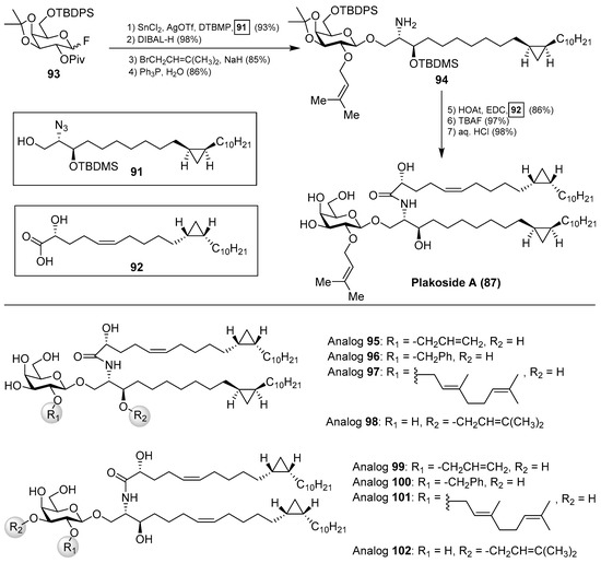 The interesting molecular structures of the plakosides, combined with their intriguing immunosuppressive activity, have prompted their total synthesis to further investigate their biological properties. Thus, Nicolaou et al. [47] reported an efficient and stereoselective total synthesis of these glycosphingolipids, which provided not only sufficient amounts of the compounds for further biological studies, but also some analogues that allowed the determination of key structural factors for the immunosuppressive activity through a structure–activity-relationship study. Having prepared the cyclopropane-containing derivatives 91 and 92 in stereoselective manner, a first assembly of 91 with the corresponding galactosyl fluoride 93 was achieved in an excellent 93% yield in a stereoselective glycosylation reaction mediated by SnCl2/AgOTf. The introduction of the prenyl group was then carried out in two steps to obtain the key intermediate 94, which was prepared for the final steps (Scheme 5). These steps consisted of an amide coupling between 94 and the fatty acid 92, followed by a global protecting group deprotection in two additional steps.