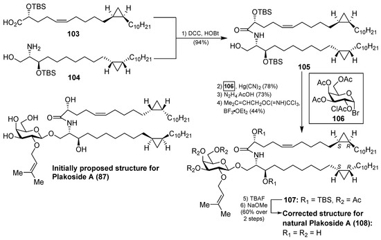 In a similar manner, the synthesis of plakoside B (88) was efficiently accomplished by using the suitable sphingosine derivative. This synthetic strategy was extended to the preparation of a small collection of plakoside analogues 95–102, in which the effect of the prenyl group upon the biological activities was analysed by modification of this group. In fact, with all these plakosides in hand, their biological activities were evaluated in three in vitro assays (the mixed-lymphocyte-reaction proliferation (MLR) assay, the concanavalin A response assay, and the murine bone marrow cell proliferation assay). Surprisingly, the authors found that all these compounds (95–102), and the synthetic plakosides A (87) and B (88), displayed modest immunosuppressive activity compared to the reported activities for the natural compounds. Among them, analogue 95 was the most active in the series, albeit in a modest range, with an IC50 value of 7.1 µM in the MLR proliferation assay. The discrepancy between the immunosuppressive activities of the synthetic plakosides and of the natural products reported in the literature could be explained by the work of Mori et al., who corrected the absolute configuration initially assigned for the plakosides [48,49]. These authors demonstrated, through their total synthesis described in Scheme 6, that the absolute configurations of the stereogenic carbons of the cyclopropane rings present in both lipidic chains, through compounds 103 and 104, were opposite to those initially proposed by the Fattorusso’s group [50,51]. The incorrect configurations assigned for plakoside A (108) could explain the poor immunosuppressive activity exhibited by the synthetic plakosides A and B prepared by Nicolaou et al. which corresponded to the stereoisomers of the naturally ocurring counterparts. It is interesting to point out that the structures of the synthetic plakosides obtained by Nicolaou’s group possessed the same spectroscopic data and optical rotations as those from naturally occurring plakosides. This fact led them to conclude that the synthetic plakosides were the same as the naturally occurring counterparts.