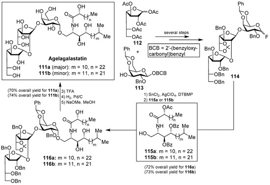 This intriguing structure, in conjuction with its antitumor activity, drew the attention of many synthetic chemists and, as a consequence, a total synthesis of agelagalastatin (111) was reported by Kim et al. [56] based on an α-selective glycosylation of the ceramide 115a or 115b with the trisaccharide fluoride 114, prepared from monosaccharide derivatives 112 and 113 after several steps. This key glycosylation reaction, performed in the presence of SnCl2, AgClO4, and DTBMP, furnished 116a and 116b in 72 and 73% yields, respectively. Completion of the synthesis involved the final deprotection of the benzyl, O-acetyl, and O-benzoyl groups in 70 and 74% overall yields to obtain agelagalastatins 111a and 111b, respectively (Scheme 7).