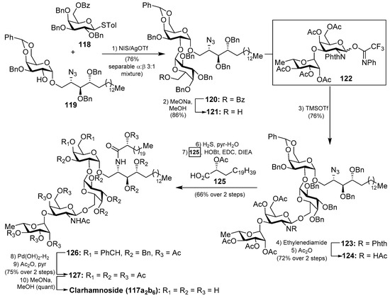 The first total synthesis of a clarhamnoside member (117a2b6) was carried out by Li et al. [58]. According to this work, the glycosylation reaction between 118 and 119, promoted by the NIS/AgOTf system, afforded a 3:1 α:β separable mixture of the disaccharide 120 in 76% yield. Removal of the benzoyl group in 120 gave the disaccharide 121 in 86% yield, which was used as an acceptor for the next glycosylation reaction. In this reaction, 121 was reacted with donor trifluoroacetimidate 122 employing TMSOTf and 4 Å MS at −20 °C to provide the β-glycoside 123 in 76% yield. Conversion of the N-phthalimido group into an acetamido group by sequential treatment with ethylenediamine and Ac2O afforded 124 in 72% yield in two steps. The reduction of 124, employing H2S in pyridine/water, was prior to the corresponding coupling of the resulting amine with α-hydroxy acid 125 to provide 126 in 66% yield in two steps. Final hydrogenolysis afforded the corresponding tetrasaccharide intermediate, which was acetylated to obtain clarhamnoside peracetate 127. Removal of the acetyl groups furnished clarhamnoside 117a2b6 in a moderately good yield (Scheme 8).