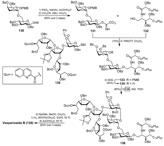 The resulting glycosphingolipid 133 was then prepared for assembly with the tetrasaccharide fragment in the form of thioglycoside 135. To this end, the removal of the PMB group of 133 by treatment with DDQ provided the alcohol 134, which was reacted with the donor 135 under the action of the promoter NIS/TfOH. The resulting complex glycosphingolipid 136, obtained in excellent yield and stereoselectively, was then transformed into natural vesparioside B (129) after removal of all the protecting groups in a 60% overall yield in three steps (Scheme 9).