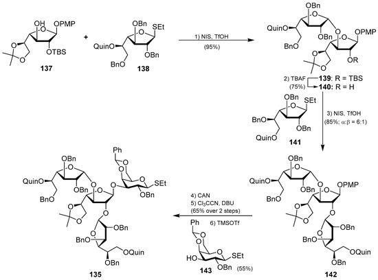 Interestingly, the preparation of the tetrasaccharide 135 required the stereoselective synthesis of 1,2-cis-α-galactofuranoside units, for which some methods have been recently developed. In this case, Yang’s group has developed an elegant methodology based on a hydrogen-bond-mediated aglycone delivery (HAD) strategy for which they employed a 2-quinolinecarbonyl (Quin) functionality. This group, acting as an H-bond acceptor and incorporated in the α-face of the galactofuranoside ring, displays a strong α-stereocontrol effect in glycosylation reactions when furanosyl thioglycoside donors are employed in reactions with various acceptors. The application of this strategy in the synthesis of tetrasaccharide 135 commenced with the glycosylation reaction of the readily available galactofuranosyl acceptor 137 and the donor 138, which was armed with the Quin group at the 5-position. This reaction delivered exclusively the α-disaccharide 139 in an excellent 95% yield, proving the reliability and validity of this strategy. The assembly of the third galactofuranosyl derivative proved more challenging, as the use of the 5-O-Quin derivative 138 as a donor did not work, resulting in recovered starting materials. Fortunately, when the 6-O-Quin derivative 141 was used instead, the reaction afforded the expected trisaccharide 142 as a 6:1 α/β separable mixture in an 85% combined yield. Finally, the fourth glycoside was incorporated through a glycosylation reaction with the trichloroacetamidate derivative of 142 and the thioglycoside acceptor 143 to deliver tetrasaccharide 135 in a 55% yield as a single β-anomer (Scheme 10). This total synthesis not only confirmed the molecular structure of this fascinating glycosphingolipid, but also, more importantly, provided the opportunity for further biological exploration of this class of compounds, which was not achievable due to the scarcity of material from natural sources. These biological studies with synthetic vespariosides are currently in progress.