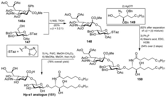 Several syntheses of these natural products have been reported [64]. Initial synthetic efforts were carried out by Tsai et al. [65], who prepared the ganglioside Hp-s1 analogue 151. The synthesis was accomplished by a sequence of chemoselective glycosylation reactions as key steps. Thus, the disaccharide 148 was obtained by the sialylation of the acceptor 147 with the sialyl donor 146a, mediated by NIS/TfOH as a promoter at −30 °C in the presence of 4 Å molecular sieves, in 63% yield as an inseparable α:β 3.2:1 mixture. The next glycosylation reaction involved the resulting disaccharide 148 with the azidosphingosine derivative 149 in the presence of AgOTf and 3 Å molecular sieves at room temperature to obtain the resulting disaccharide derivative as a separable mixture of αβ and ββ anomers in 62% combined yield. From the corresponding αβ anomer, a Staudinger reaction was followed by an amidation process to obtain 150 in 54% yield in two steps. Final debenzylation and deacetylation reactions afforded the ganglioside Hp-s1 analogue 151 in 78% overall yield (Scheme 11). This analogue exhibited neurogenetic activity towards the human neuroblastoma cell line SH-SY5Y without the presence of NGF.
