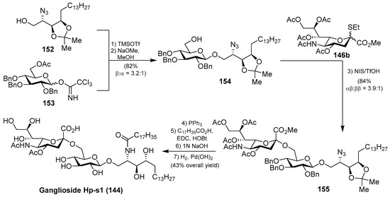 A different synthetic strategy was used in the first total synthesis of ganglioside Hp-s1 (144), achieved by Luo et al. [64], based on two key glycosylation reactions. According to this synthetic strategy, after an extensive optimization of the glycosylation reactions, the authors found that the first reaction of phytosphingosine 152 with benzyl protected imidate 153, using TMSOTf as a promoter at −30 °C to room temperature, followed by a deacetylation step, afforded 154 in 82% (β:α 3.2:1) yield. The second glycosylation reaction involved the glycosyl acceptor 154 and the sialyl donor 146b, mediated by NIS/TfOH as a promoter, to obtain 155 in 84% yield (αβ:ββ 3.9:1). From 155, the conversion of the azide group into the corresponding amine, through a Staudinger reaction, followed by amide formation, and final deprotection of acetyl, benzyl, and acetonide groups delivered ganglioside Hp-s1 (144) in 43% overall yield from 155 (Scheme 12).