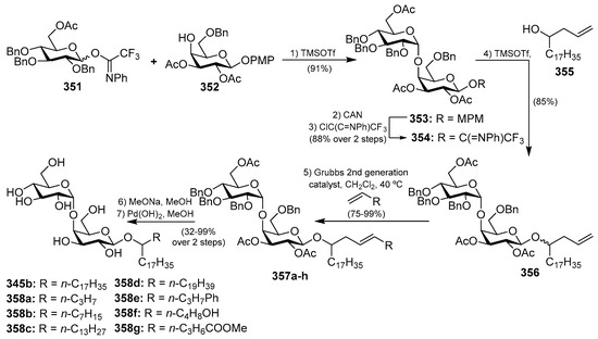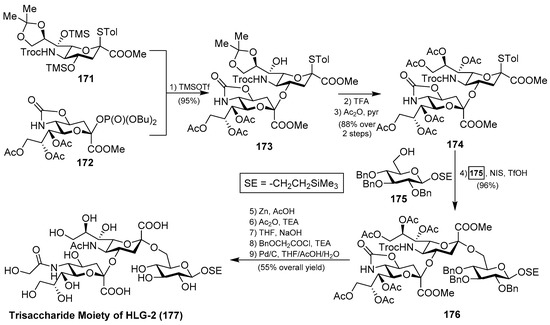 - Xu, F.-F.; Wang, Y.; Xiong, D.-C.; Ye, X.-S. Stereoselective Synthesis of the Trisaccharide Moiety of Ganglioside HLG-2. J. Org. Chem. 2014, 79, 797–802. [Google Scholar] [CrossRef] [PubMed]