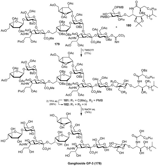 - Goto, K.; Sawa, M.; Tamai, H.; Imamura, A.; Ando, H.; Ishida, H.; Kiso, M. The Total Synthesis of Starfish Ganglioside GP3 Bearing a Unique Sialyl Glycan Architecture. Chem. Eur. J. 2016, 22, 8323–8331. [Google Scholar] [CrossRef] [PubMed]