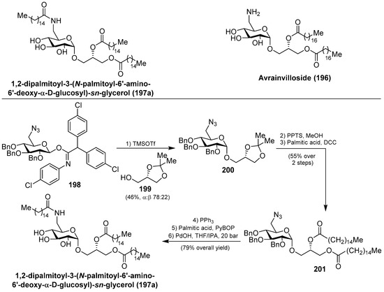 - Göllner, C.; Philipp, C.; Dobner, B.; Sippl, W.; Schmidt, M. First Total Synthesis of 1,2-dipalmitoyl-3-(N-palmitoyl-6′-amino-6′-deoxy-α-d-glucosyl)-sn-glycerol—A Glycoglycerolipid of a Marine Alga with a High Inhibitor Activity against Human Myt1-Kinase. Carbohydr. Res. 2009, 344, 1628–1631. [Google Scholar] [CrossRef] [PubMed]