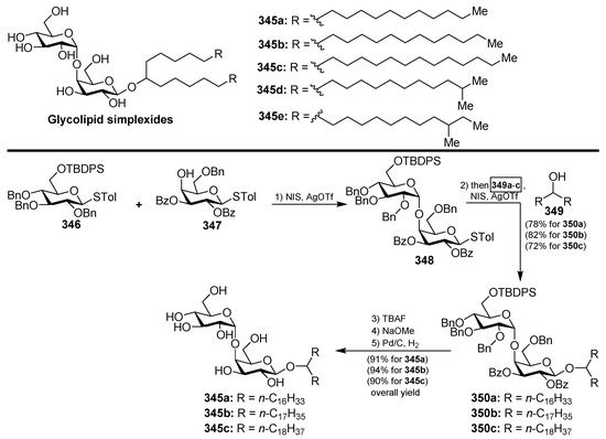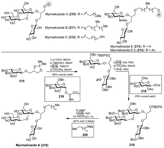 - Zhang, J.; Li, C.; Sun, L.; Yu, G.; Guan, H. Total Synthesis of Myrmekioside A, a Mono-O-alkyl-diglycosylglycerol from Marine Sponge Myrmekioderma sp.: Total Synthesis of Myrmekioside A. Eur. J. Org. Chem. 2015, 2015, 4246–4253. [Google Scholar] [CrossRef]